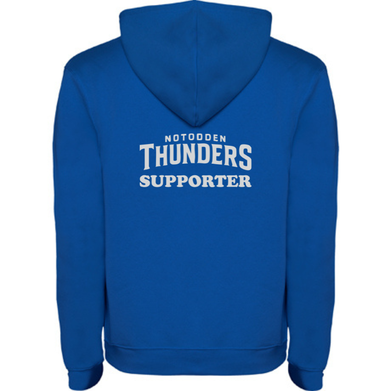 På brystet finner du Notodden Thunders-logoen, mens ryggen prydes av teksten “Notodden Thunders Supporter” – et tydelig symbol på lojalitet til laget.